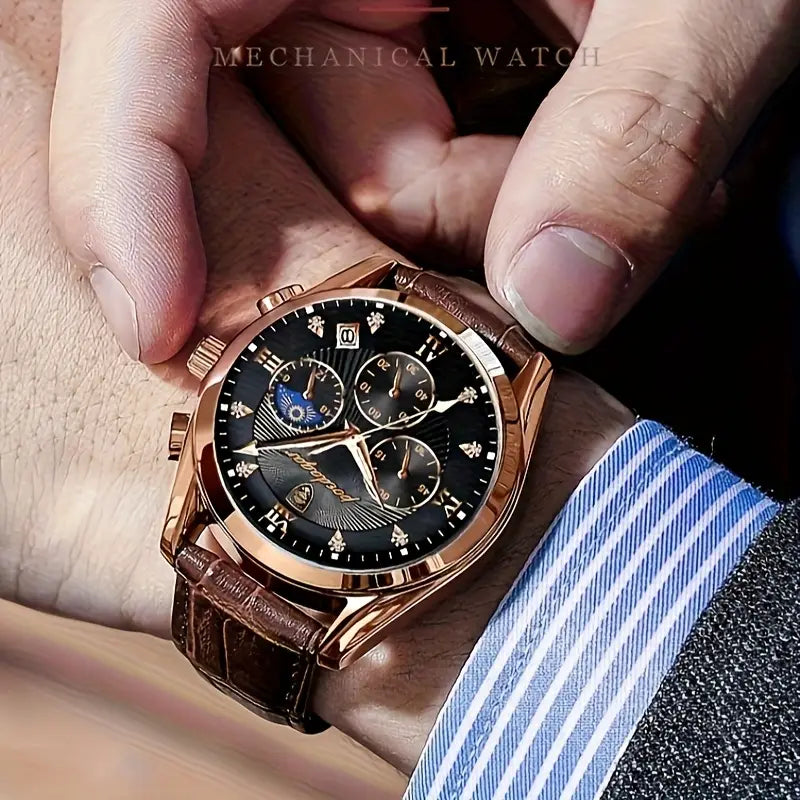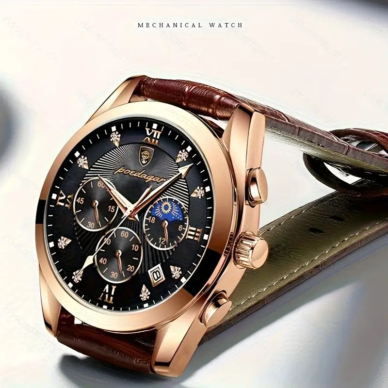 Das robuste Gehäuse mit Edelstahllook verleiht der Uhr einen eleganten, maskulinen Charakter. Das weiche, formstabile Lederarmband sorgt für optimalen Tragekomfort und passt sich dezent jedem Outfit an – ob im Business, bei festlichen Anlässen oder in der Freizeit.