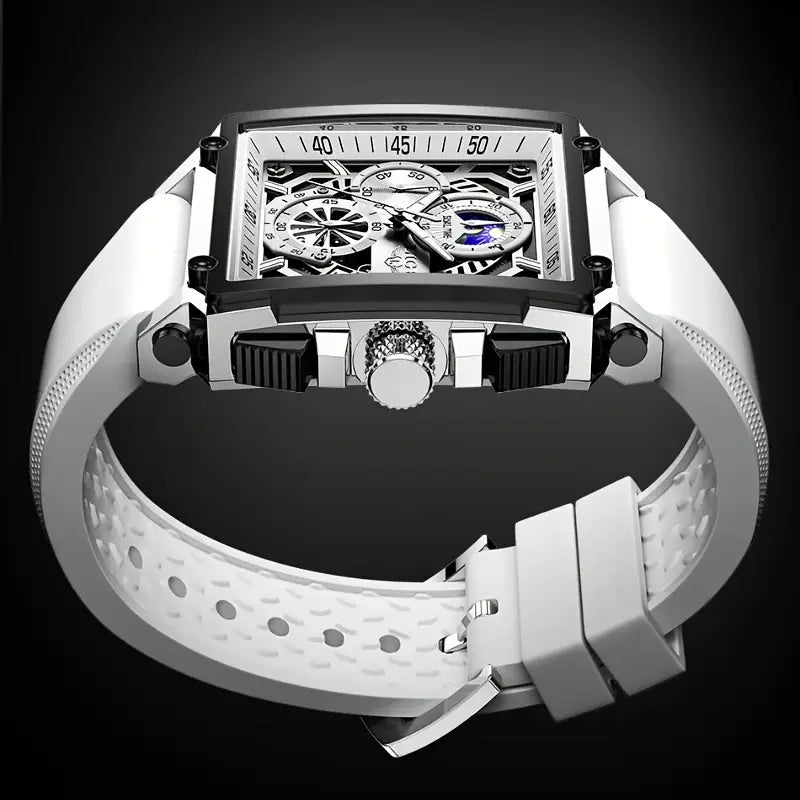 Diese stilvolle Herrenarmbanduhr überzeugt durch ihr elegantes Design, funktionale Vielseitigkeit und hochwertige Verarbeitung. Das ausgehöhlte Zifferblatt mit integrierter Mondphasenanzeige verleiht der Uhr einen besonderen Charakter – ideal für Männer und Frauen mit Sinn für Ästhetik und Technik.