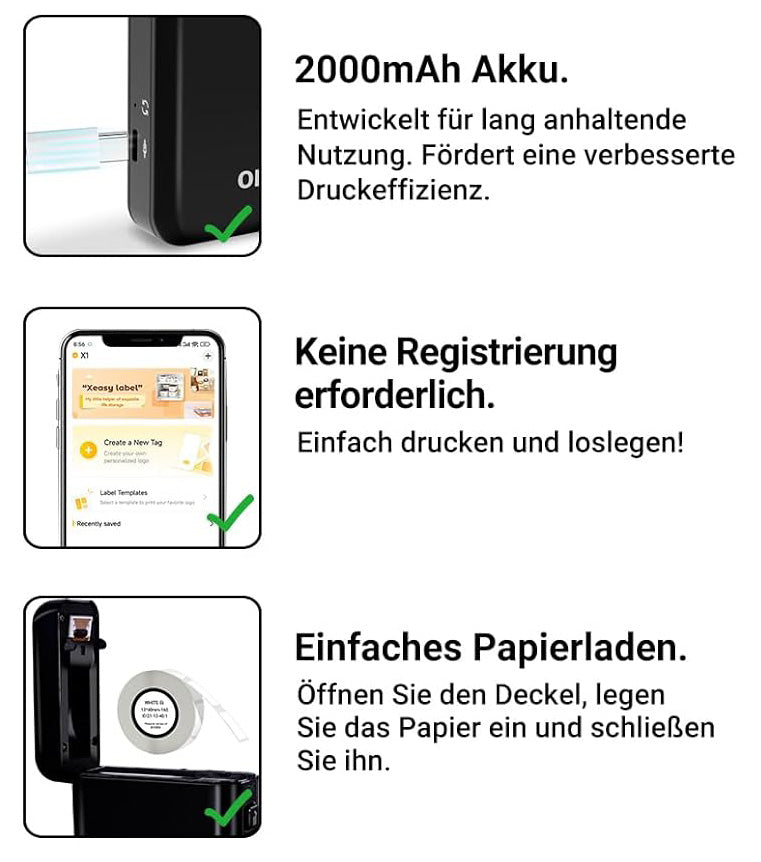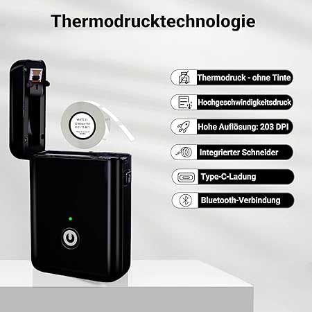 Mit dem Premium X1 erstellen Sie professionelle, selbstklebende Etiketten direkt per Smartphone. Ob Küche, Büro, Lager oder Werkstatt – beschriften Sie Gewürzgläser, Vorratsdosen, Ordner, Kabel, Boxen oder Geräte sauber und dauerhaft. Dank Thermodruck benötigen Sie keine Tinte und keinen Toner – einfach verbinden, gestalten, drucken.