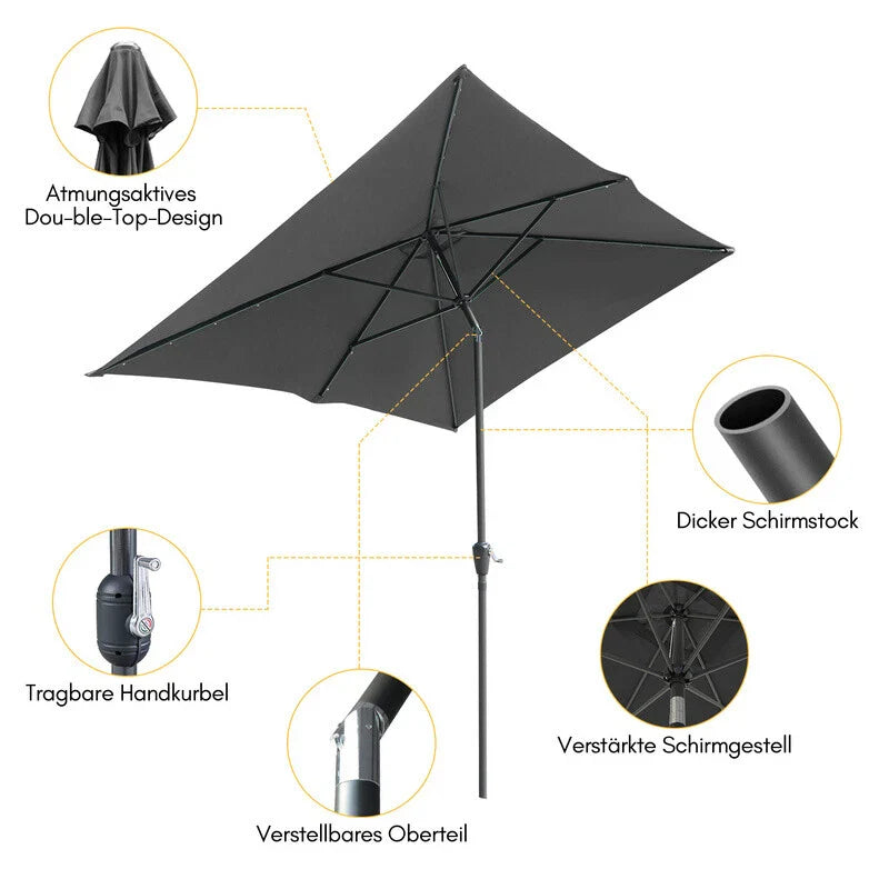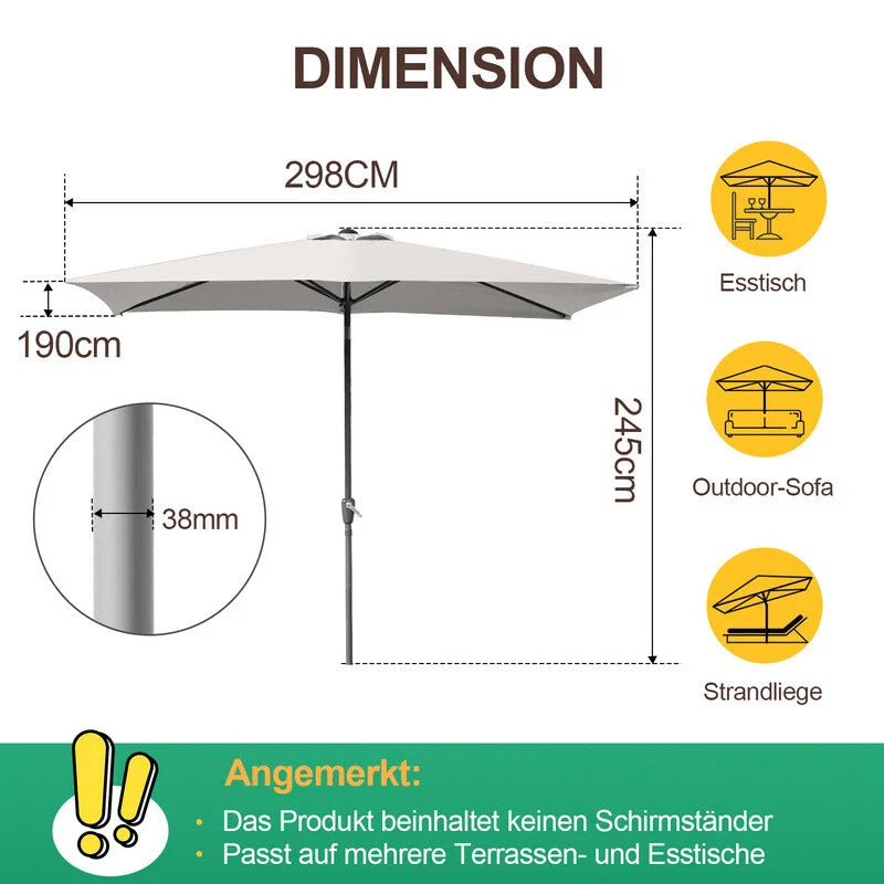 Dieser rechteckige Sonnenschirm mit großzügigen Maßen von 2 × 3 Metern bietet perfekten Schatten für Terrasse, Balkon, Garten oder Gastronomie. Dank hochwertiger Materialien und cleverer Technik ist er ideal für den täglichen Einsatz.