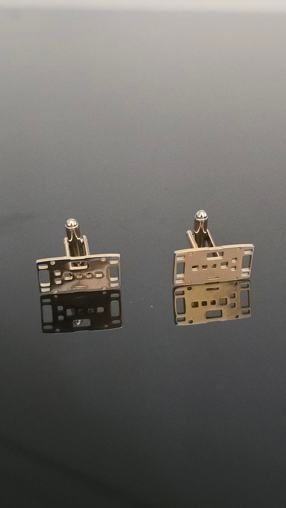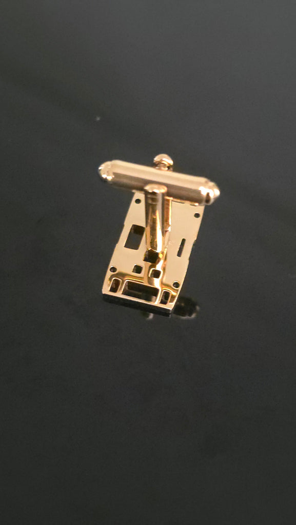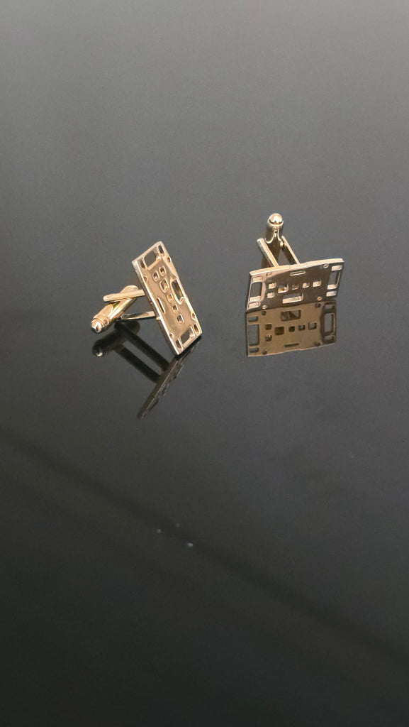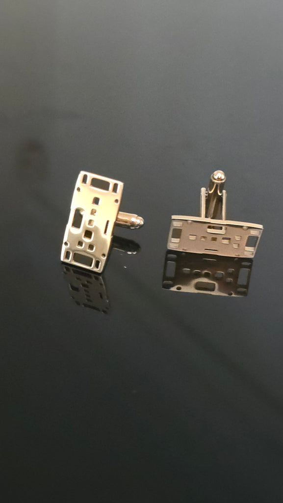 Diese außergewöhnlichen Manschettenknöpfe sind aus herumliegenden Baustellen-Fußplatten (Bodenplatten) inspiriert und bringen urbanen Charme direkt an Ihr Hemd. Handgefertigt als Modeschmuck, veredelt in glänzendem Gold-Finish, vereinen sie raues Industrie-Design mit eleganter Mode.