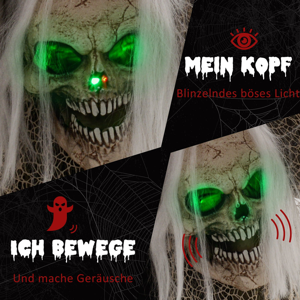 Dank Geräusch- und Berührungssensor erwacht die Figur sofort zum Leben: Der Kopf dreht sich, die Arme bewegen sich, die Augen leuchten gespenstisch, und ein unheimliches Heulen erfüllt den Raum. Zusätzlich können Sie die Animationen per Knopfdruck auch manuell aktivieren.