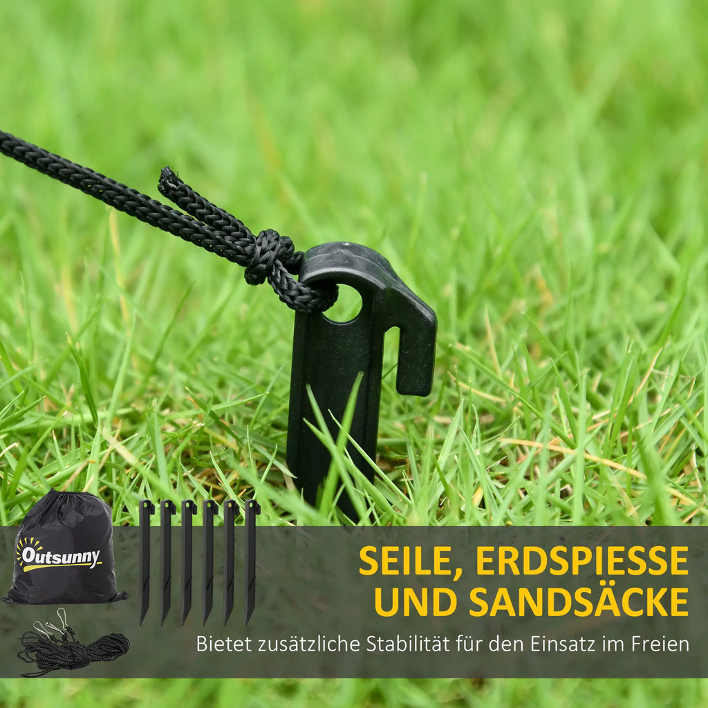 • 🪢 Inklusive 6 Erdspießen, 3 Seilen & 2 Sandsäcken für stabilen Stand