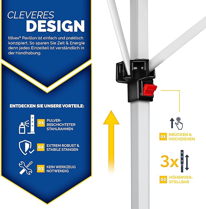 Das 3-fach höhenverstellbare System ermöglicht eine individuelle Anpassung der Höhe zwischen 2,3 m und 2,5 m, sodass das Pavillon flexibel einsetzbar ist. Nach Gebrauch lässt es sich kompakt zusammenfalten und in der mitgelieferten Tragetasche platzsparend verstauen und transportieren.