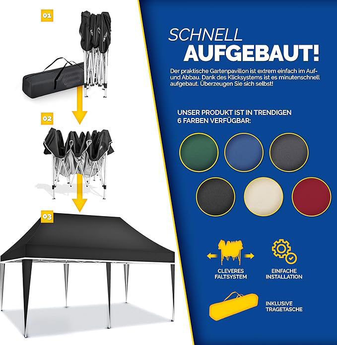 Der 3x6 Meter Faltpavillon ist die ideale Lösung für Garten, Terrasse, Veranstaltungen oder Camping. Dank der wasserdichten Dachbespannung und UV 50+ Schutz bietet er zuverlässigen Komfort bei jeder Witterung. Das stabile Stahlgestell mit Pulverbeschichtung sorgt für eine hohe Standfestigkeit, während das Pop-Up Klicksystem den Auf- und Abbau in wenigen Minuten ermöglicht – ganz ohne Werkzeug.